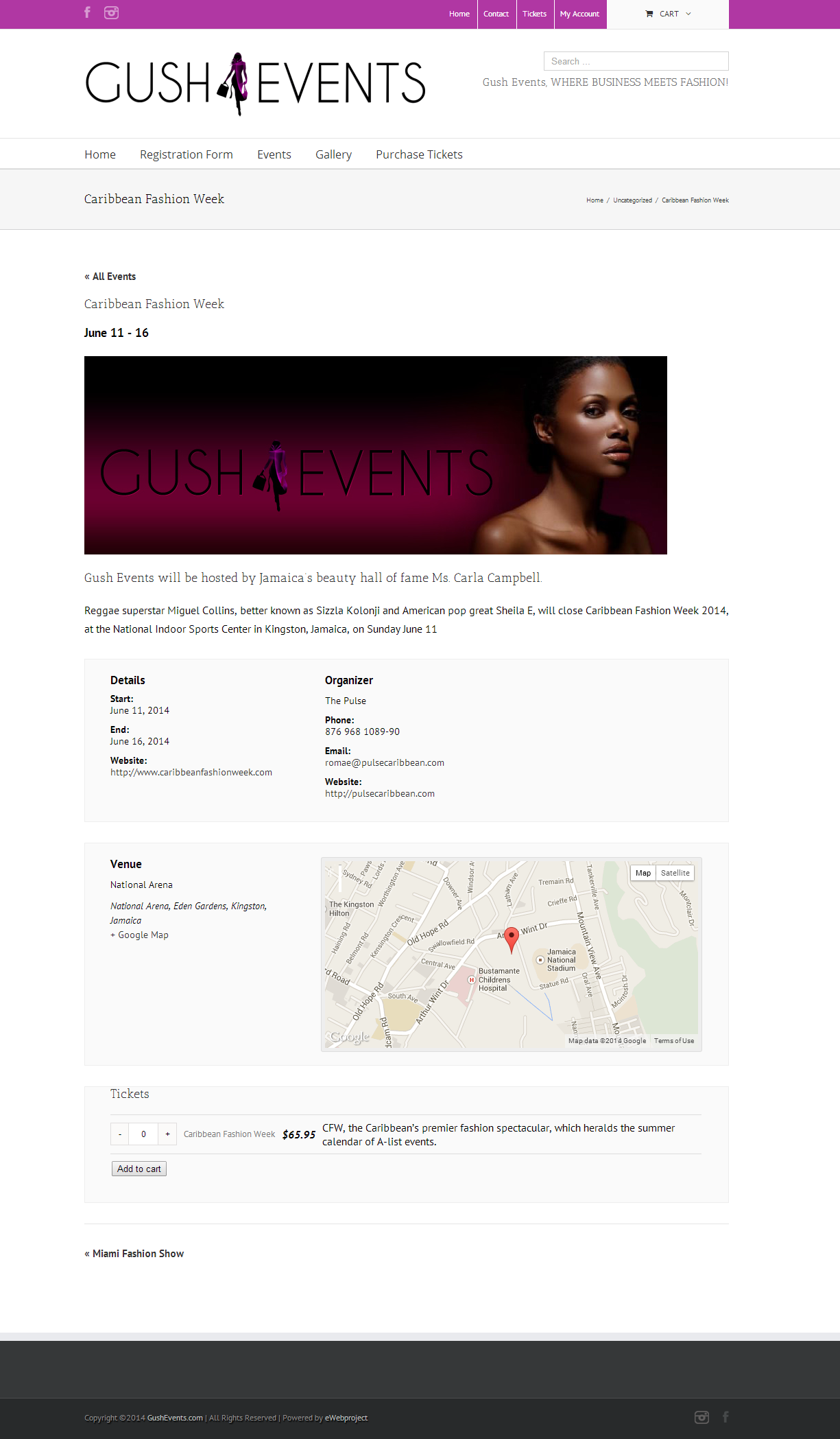 With ticket selling, ecommerce functionality admin can easily create an event, set a date, ticket price and publish it in minutes, making all tickets available for purchase online immediately. Although there are no merchandises here for sale – this is fully functional ecommerce web design allowing visitors to purchase tickets online in the same way they would buy some product in any given shopping cart website.