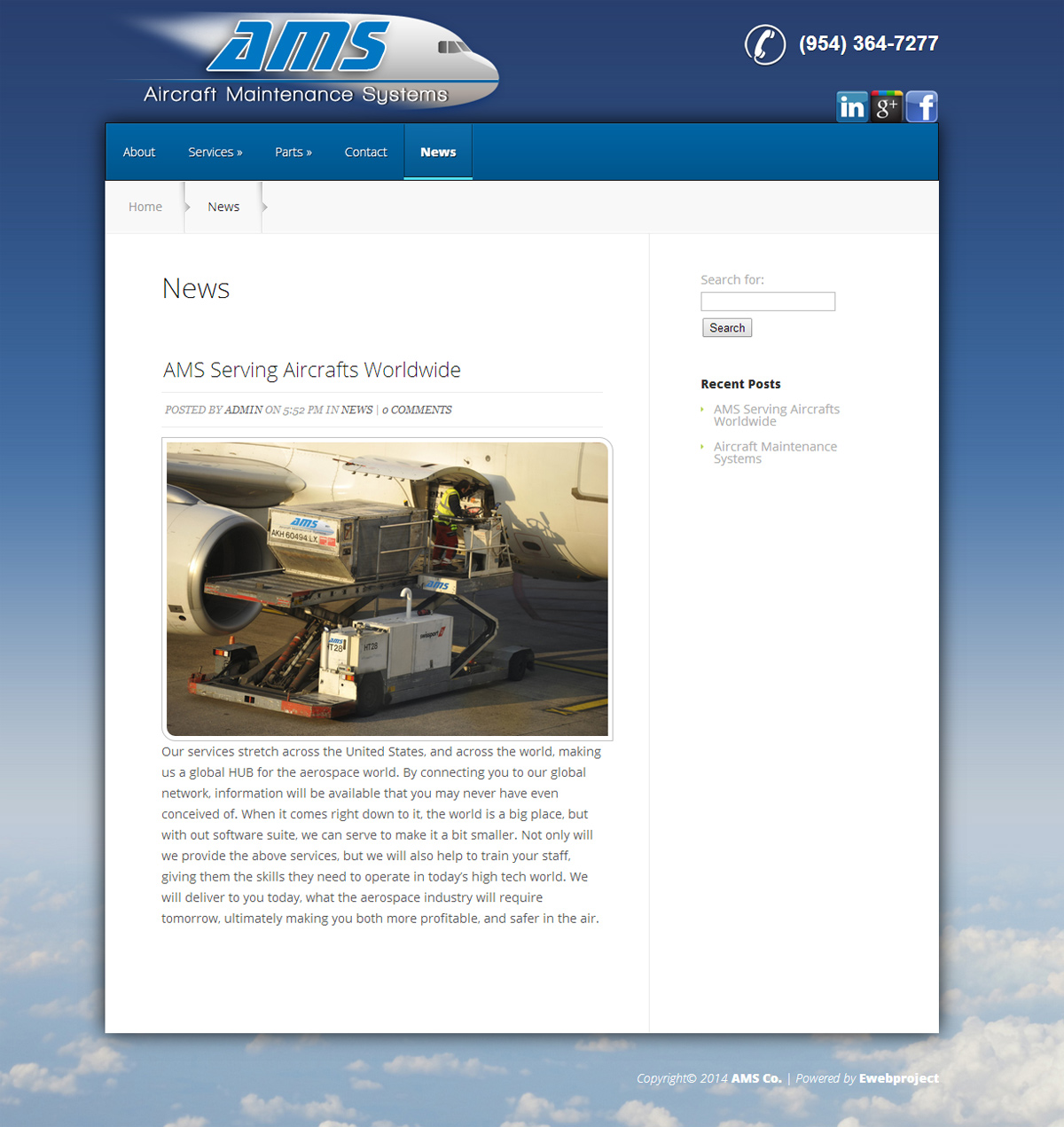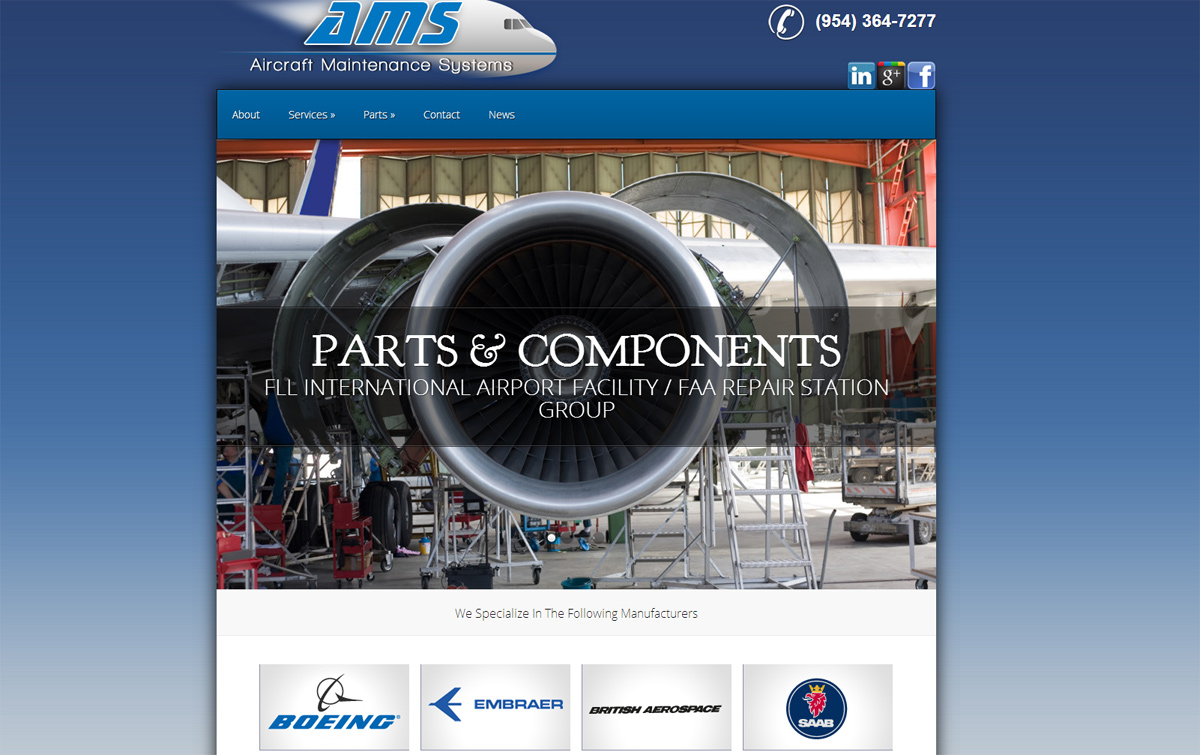 When it comes to the aviation industry there is nothing quite as important as keeping planes in the air, and of course, having the parts to do so. Located in Fort Lauderdale AMS, or Aircraft Management Systems is an outstanding provider of some of the best parts in the industry, ensuring that the aircraft placed under its care receive not only the maintenance they need, but also a steady supply of new/used parts which would have been very difficult to locate otherwise. As a local Fort Lauderdale web design provider we were able to maintain very personalized service, and work with AMS on every step of this website. AMS headquarters are located in Fort Lauderdale, but web design illustrates their world wide aircraft maintenance services, is very purpose driven and each aircraft service offered by AMS is clearly labeled and described within their website design.