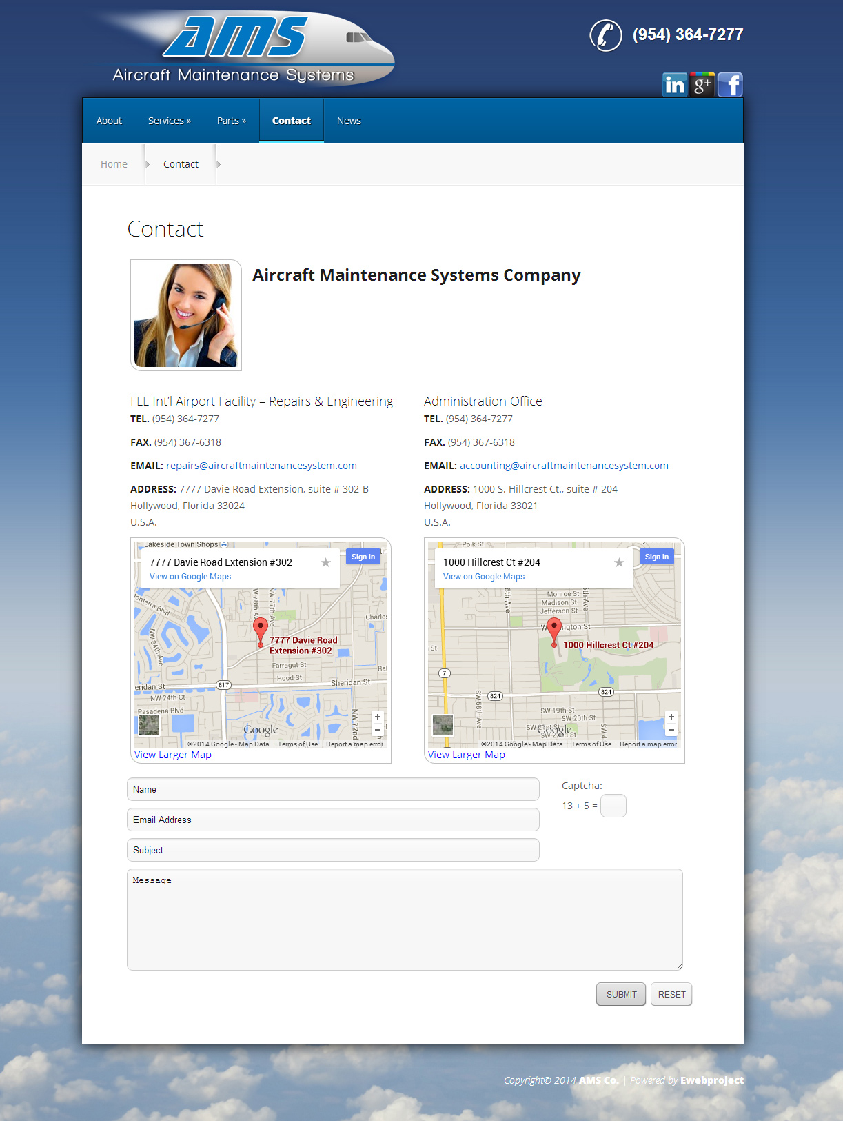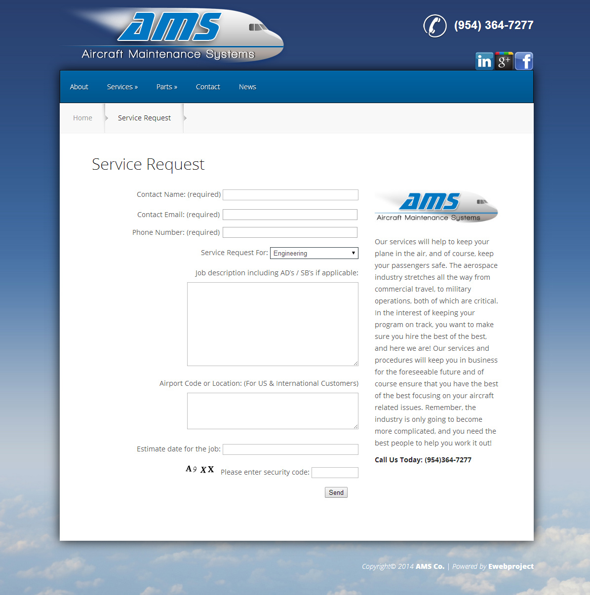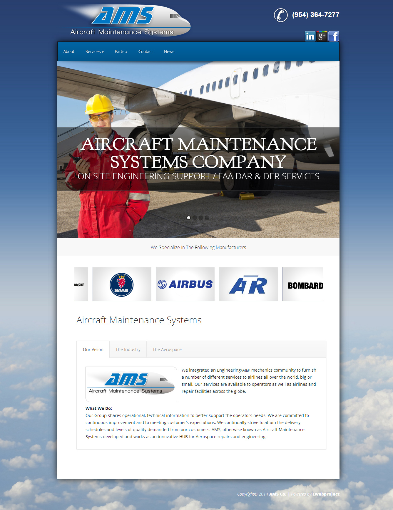AMS as a great part of all available aircraft maintenance services in Fort Lauderdale and web design developed for them reflects just that. You will find all the website features that you would see in a typical full sized corporate site. For example, a few clicks will take you to a custom request form, and a few more will permit you to browse a list of available parts. The rest of the website can be viewed quickly, which is a must for those who are interested in ordering parts or services from the company. It’s all about getting in and out with as little hassle as humanly possible.
